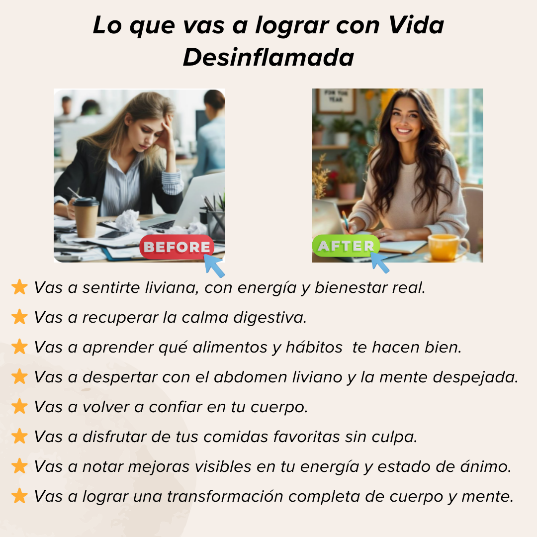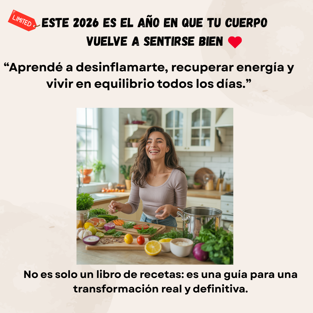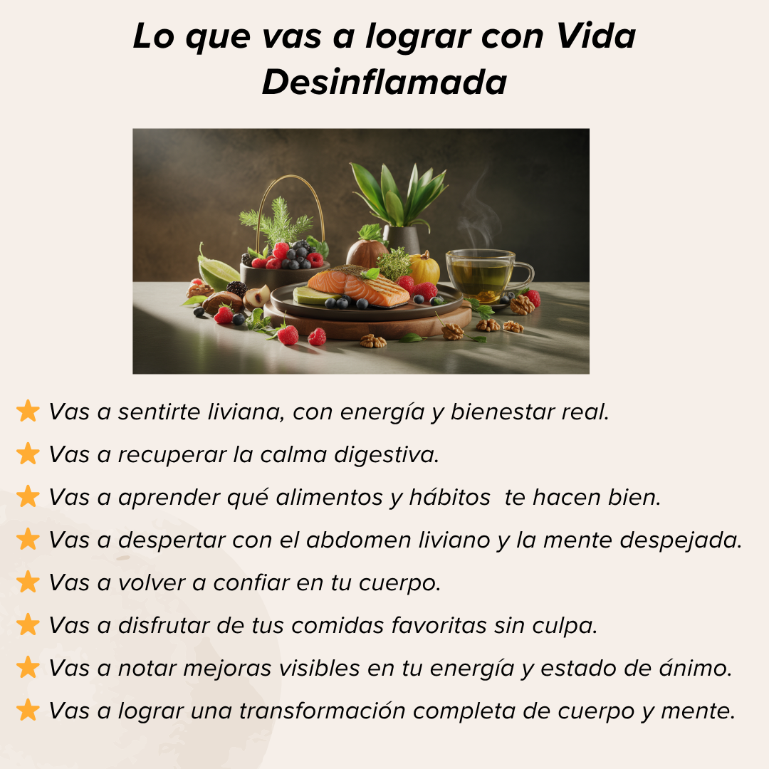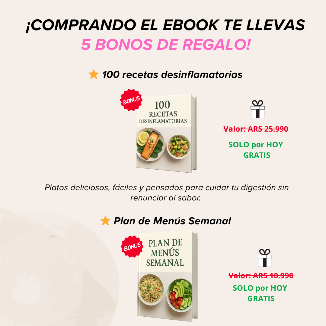 Incluye un plan paso a paso de 14 días, herramientas prácticas, recetas desinflamatorias, menús semanales y bonos exclusivos para acompañarte en cada etapa.