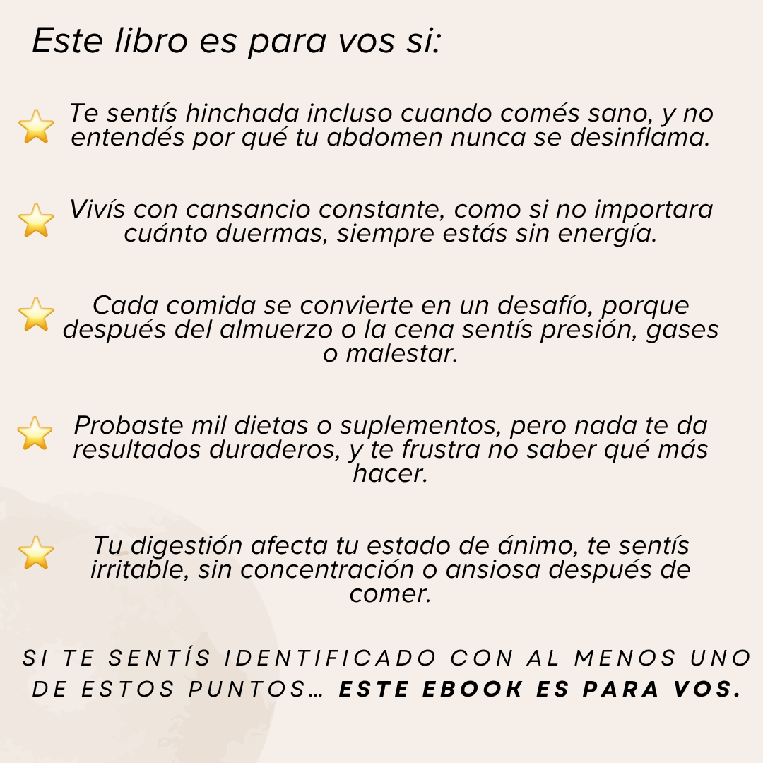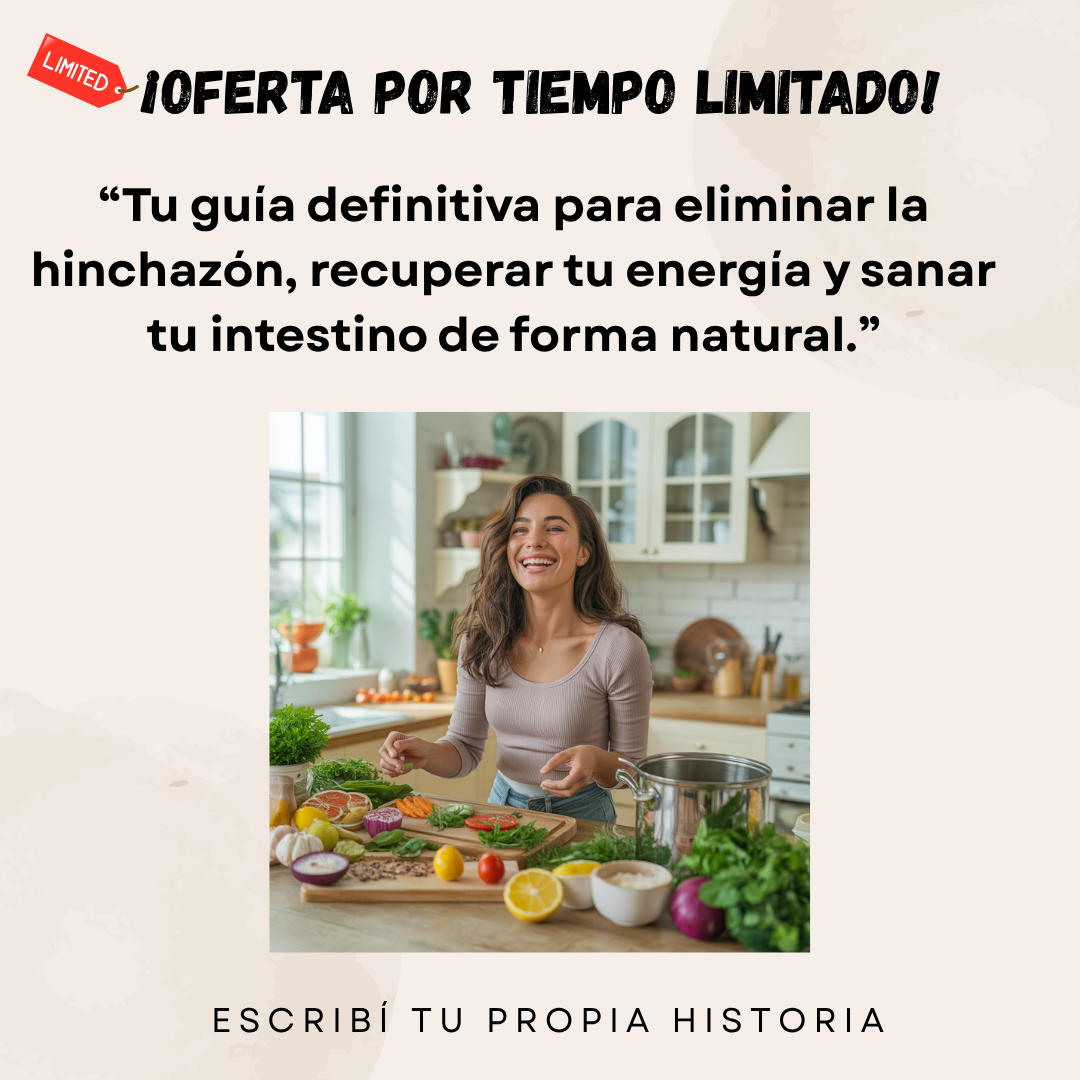 Es un ebook digital que reúne todo lo que necesitás para eliminar la hinchazón, mejorar tu digestión y recuperar tu energía de forma natural.